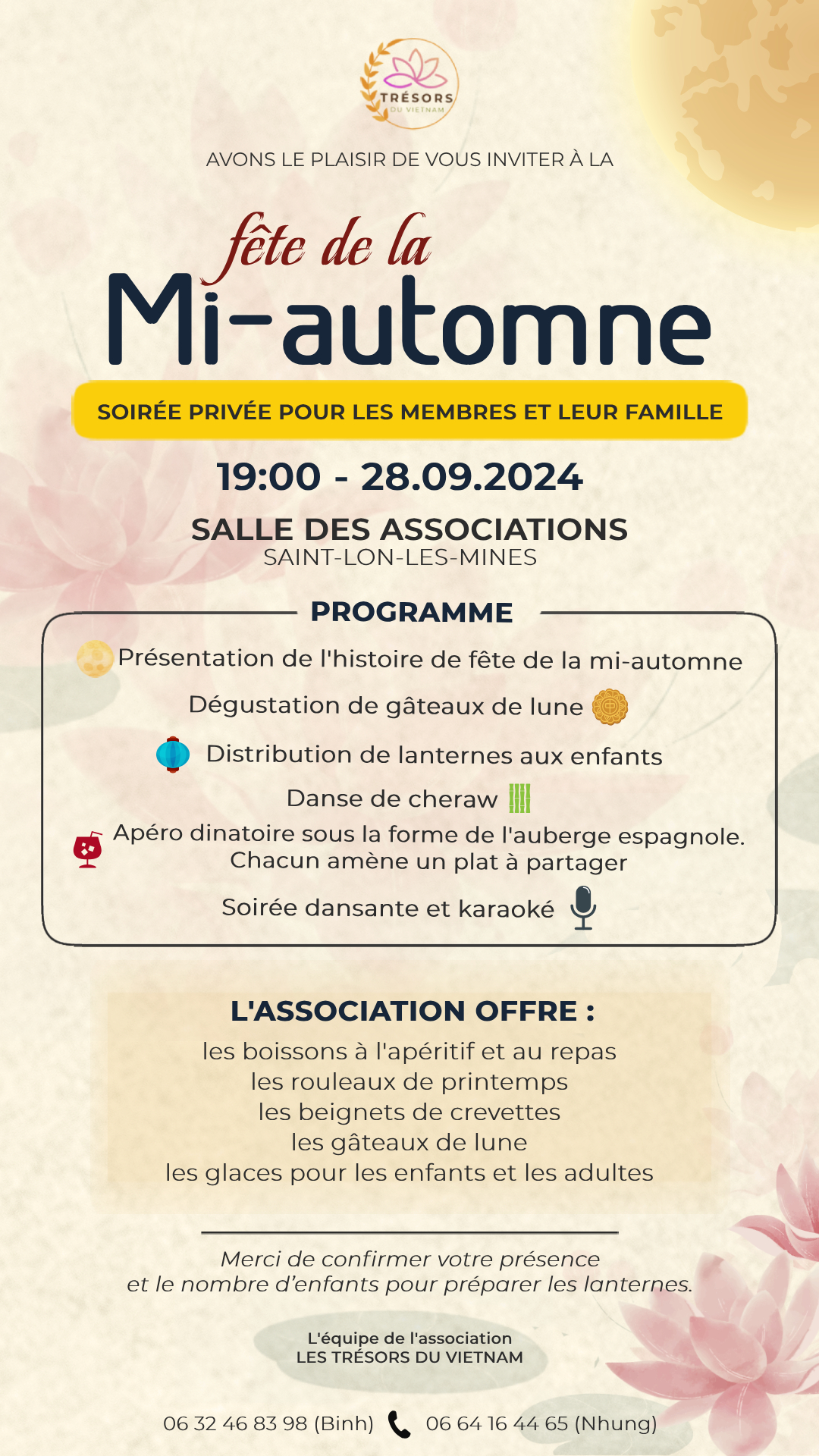 Nous sommes heureux de vous accueillir et de partager avec vous notre passion pour la culture, les traditions et les coutumes vietnamiennes. Créée selon la loi 1901, notre association organise principalement des activités à Saint-Lon-les-Mines, mais nous sommes également ouverts à la tenue d’événements dans d’autres lieux, selon les besoins.